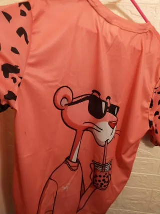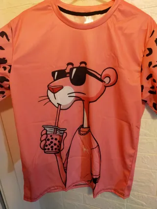 No es negociable no atiendo a personas que bajan precios por sistema Quedan cinco de este modelo muchos más en mis ventas junto con 240 artículos también nuevos de todo tipo de categorías muy variadas por cierre de negocio Camiseta de manga corta con un divertido estampado de pantera rosa bebiendo un refresco. - Diseño llamativo y original. - Mangas con estampado de leopardo. Totalmente nuevas sin estrenar De Cornellá Barcelona vivo cerca del metro línea 5 y Ronda de Dalt salida 14