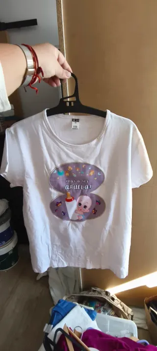 Camiseta blanca con un divertido estampado para anunciar que vas a ser abuela. El diseño incluye un bebé con un biberón y elementos decorativos. - Estampado ¡Vas a ser ABUELA, ABUELO, TIA! - Dibujo de bebé con biberón - Adornos de mariposas y lunas - Cada camiseta se vende por 10 euros