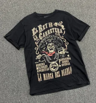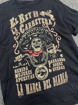 Camiseta con un diseño gráfico llamativo. - Estampado frontal El Rey de la Carretera. - Ilustración de calavera con sombrero y botella de tequila. - Incluye texto Bebida, Mujeres, Apuestas y La Marca del Diablo. - Detalle de México en la parte superior.