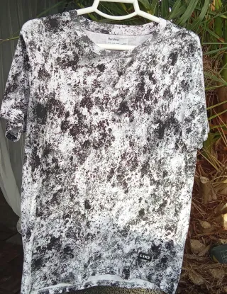 Camiseta de Bershka con un llamativo estampado abstracto en blanco y negro. Perfecta para un look casual. - Diseño con manchas y salpicaduras. - Corte clásico. - Tejido suave y cómodo.