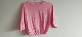 Camiseta corta de Bershka en color rosa chicle. Es una prenda versátil y cómoda. - Diseño de manga corta - Bajo ajustable con cordón. - Cuello redondo.