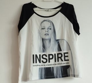 Camiseta de manga corta con estampado frontal. - Diseño con imagen de mujer. - Texto INSPIRE y frase Everything you do is based on the choices you make. - Mangas raglán en contraste.
