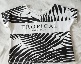 Pack de tres camisetas de Bershka con diseños veraniegos. - Camiseta naranja lisa talla XS - Camiseta gris con estampado Beach Club y palmeras. Talla XS - Camiseta blanca con estampado Tropical Holidays y cebra. Talla S
