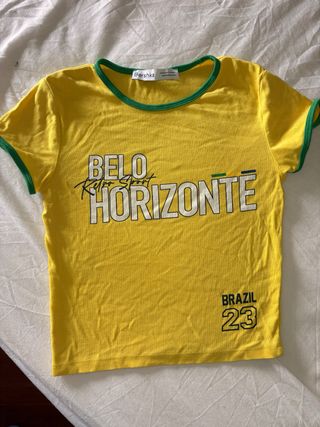 Camiseta de manga corta con cuello redondo y ribete verde. - Diseño Belo Horizonte con detalles de colores. - Número 23 y Brazil en la parte inferior. - Etiqueta de la marca Bershka visible.
