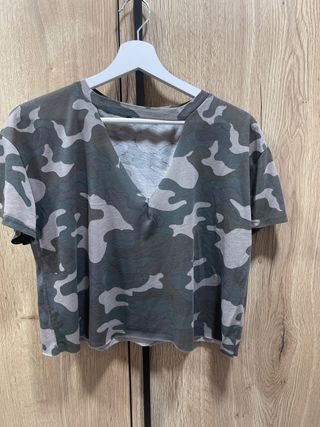 Camiseta de corte oversize y estilo corto con estampado de camuflaje. - Diseño con cuello en pico. - Mangas cortas. - Bajo deshilachado.