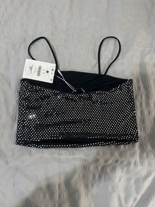 Camiseta Top de Bershka con un diseño de lunares plateados sobre fondo negro de terciopelo. - Tejido de terciopelo. - Corte acampanado en la parte inferior.