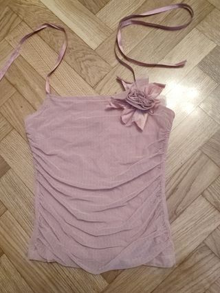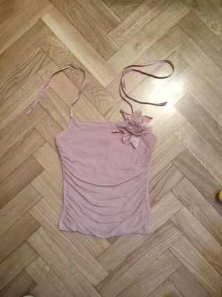 Camiseta super elegante con flor en la parte delantera frunces en laterales y tirantes de raso para atar al cuello Da poca talla Tiene dos puestas