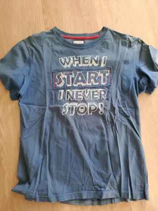 Camiseta de manga corta con un diseño llamativo. - Estampado frontal con texto When I start I never stop. - Cuello redondo con detalle de pespunte en rojo.