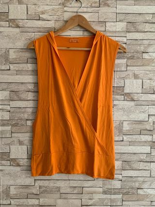 Camiseta en color naranja y otra en color rosa fucsia sin mangas, mitón abajo y capucha. Escote abierto en pico. Talla L