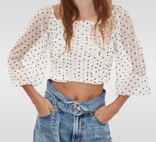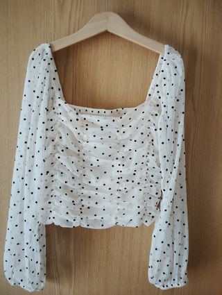 Top de manga larga, cuerpo drapeado y espalda elástica tipo nido de abeja. Color blanco roto y topos negros. Talla XS