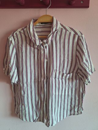 Preciosa camisa de rayas, de manga corta y corte cropped. Es de color blanco con rayas rosa y azules. - Cierre de botones. - Bolsillo delantero. - Tejido ligero y suave.