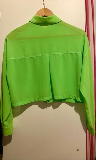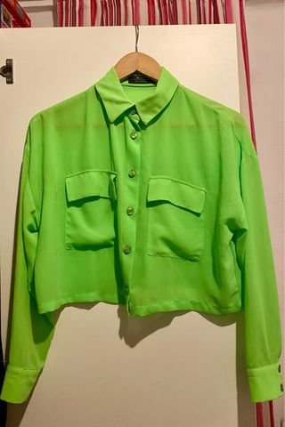 Camisa de manga larga con un llamativo color verde flúor. - Diseño crop top. - Dos bolsillos en la parte delantera. - Cierre de botones. - Puños con botones.
