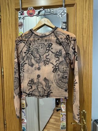 Camiseta de manga larga con un diseño llamativo de dragones y caligrafía asiática. - Tejido de malla semitransparente. - Estampado detallado en negro sobre fondo beige. - Cuello redondo y mangas largas.