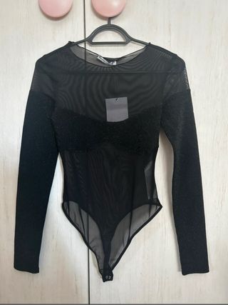 Body de manga larga con un diseño de malla transparente y detalles brillantes. Es una prenda llamativa y elegante. - Tejido de malla. - Mangas largas. - Detalles brillantes.