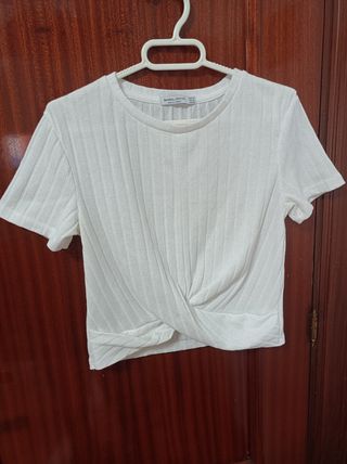 Camiseta blanca de Bershka con un diseño moderno. - Nudo delantero. - Manga corta. -Ancha