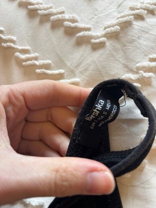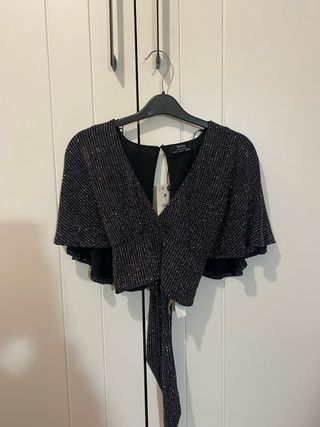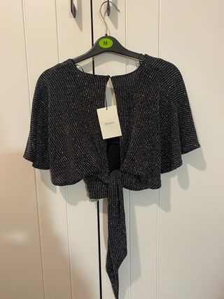 Es un top monisimo que nunca me he llegado a poner🥲, pero os dejo foto de como queda puesto al final. - Tejido con lentejuelas. - Corte cruzado con lazada. - Espalda abierta - Mangas tipo capa.