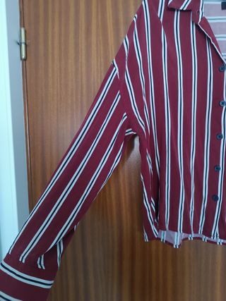 Preciosa camisa de rayas granates y blancas de Bershka. Está en muy buen estado. - Corte cropped. - Manga larga. - Cierre de botones.