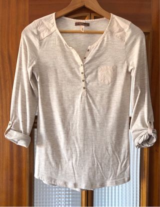 Preciosa camiseta de manga larga de Bershka en color beige claro. Es de talla M. Tiene un estilo casual y cómodo. Con tiras y botón en mangas para recogerlas. - Tejido muy suave y cómodo. - Nueva, sin estrenar. - Cierre de botones en el cuello. - Bolsillo en el pecho.