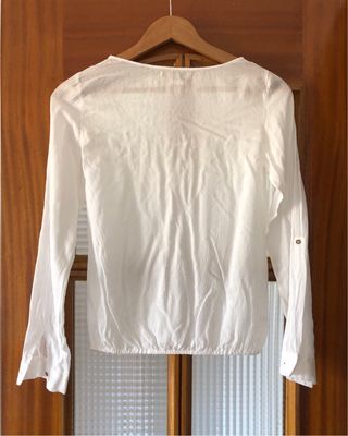Preciosa blusa de Bershka en color blanco. Es de manga larga, con cuello barco de encaje y tiene un diseño elegante con detalles en la parte delantera. Tiras con botón en las mangas para recogerlas. - Ed nueva, no se ha usado. - Talla: XS - Tejido: Algodón ligero - Estilo: Casual