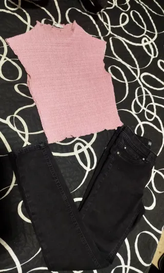 Conjunto de pantalón pitillo talla 36 y camiseta rosa maquillaje de Bershka talla S. Prácticamente nuevo.