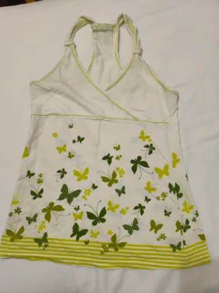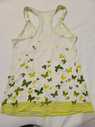 Camiseta de tirantes con un bonito estampado de mariposas en tonos verdes y blanco. El diseño es alegre y veraniego. - Tirantes cruzados en la espalda. - Dobladillo inferior con rayas verdes. - Costuras decorativas en verde claro.