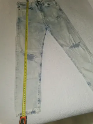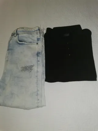 Conjunto de ropa para joven, incluye pantalón vaquero y camiseta.camiseta zara pantalón Bershka - Pantalón vaquero con rotos y efecto desgastado. - Camiseta de manga corta con cuello - Camiseta con botones en la parte frontal.