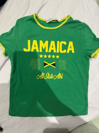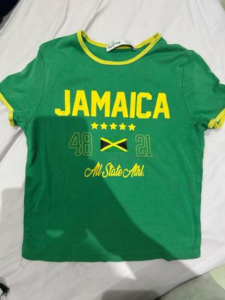 Camiseta corta de Bershka con un diseño llamativo. Talla L pero da menos talla. - Estampado frontal con chiles y texto. - Cuello redondo con ribete blanco. - Mangas cortas con ribete blanco.