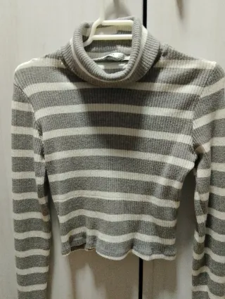 Jersey de manga larga con cuello alto y estampado de rayas horizontales. - Diseño cropped. - Tejido de canalé.