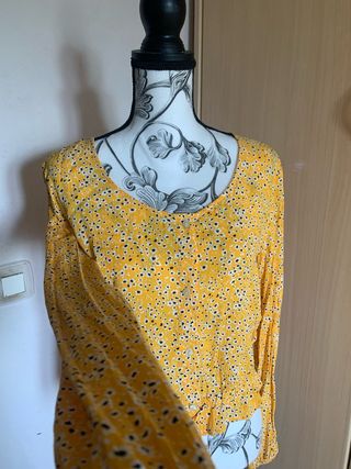 Envio rápido Talla S Es muy bonita puesta Preciosa blusa sin mangas con estampado floral. Es ligera y tiene un corte favorecedor. - Estampado de flores multicolor sobre fondo azul marino. - Cuello en pico. - Detalle de transparencia en la parte infe