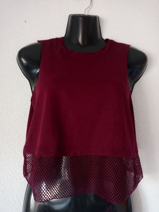 Top de chica sin mangas, color burdeos con red en la parte de abajo de la camiseta del mismo color. Medidas: largo 45cm y ancho de hombros 34cm.