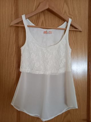Top de "Bershka". Color blanco. Talla S. Parte superior tipo encaje y parte inferior de tul semitransparente. Mucho más en mi perfil a buen precio. Perfil verificado y con bastantes valoraciones positivas. 📍ENTREGA EN MANO: PLASENCIA ZONA CENTRO 📦 ENVÍOS: MEDIANTE "WALLAPOP ENVÍOS"