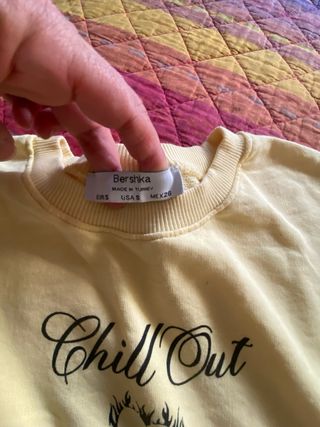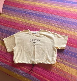 Preciosa camiseta de Bershka, color amarillo claro, con el mensaje 'Chill Out'. Es de manga corta y tiene un diseño bonito. - Talla única. - Corte cropped.