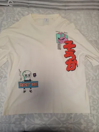 Precio dispuesto a negociar. Descuento por lotes. Camiseta de la marca Bershka en colores blanco y negro, talla S. Estado: Como nueva. Estilo: Diseño moderno y versátil. Detalles: - Tejido suave y cómodo. - Corte recto que se adapta bien al cuerpo. - Estampado frontal atractivo que combina fácilmente. - Cuello redondo. - Mangas cortas. Pregunta sin compromiso si necesitas medidas. Envío rápido y seguro