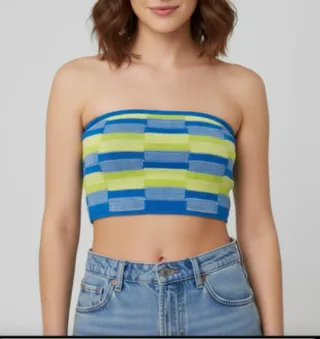 Precioso top bandeau de Bershka, tejido de punto en diseño de rayas. Es una prenda alegre y vistosa, ideal para el verano. - Diseño de rayas multicolor en azul, amarillo verdoso y blanco. - Perfecto para cualquier ocasión. - Top palabra de honor, hombros descubiertos. Sin tirantes. * Tejido elástico que se adapta al cuerpo. Corte ajustado. 68% viscosa, 32% poliéster. *Ideal para el verano o looks de festival. - Muy cómodo, con estilo retro. - Marca Bershka. MUY BUEN ESTADO. Más shorts en mi perfil. #top basic, bandeau, verano, colores vivos, top talla 36, talla m, talla 38, top festival, look casual, retro, vintage, rebajas, crop