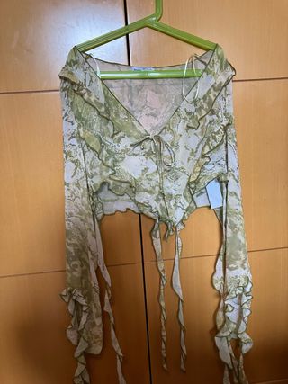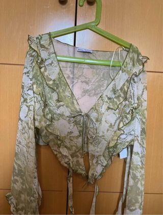 Blusa fina del Bershka. Es verde con estampado, talla XS y se conserva en perfecto estado