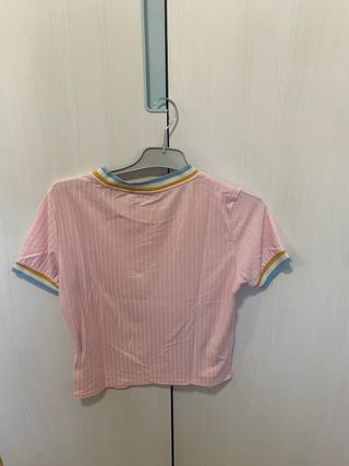Preciosa camiseta de Bershka en color rosa, talla L. Es de corte crop y tiene un diseño de canalé muy favorecedor. - Cuello redondo con ribetes en azul claro, blanco y dorado. - Manga corta. - Perfecto estado.