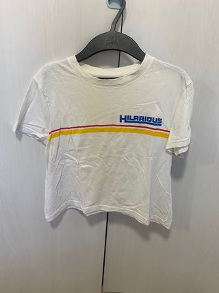 Preciosa camiseta corta y de manga corta de Bershka, en color blanco. Es una prenda cómoda y estilosa, perfecta para el verano. - Diseño de manga corta. - Estampado frontal "Hilarious" con detalles en colores rojo, amarillo y azul. - Corte cropped.