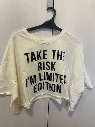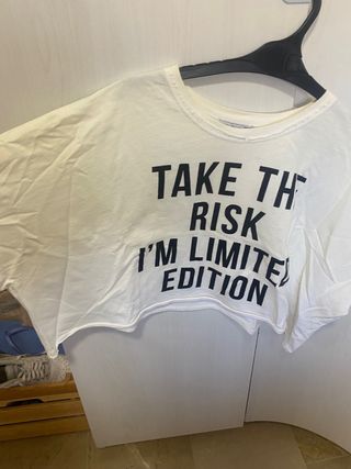 Preciosa camiseta corta y de manga corta de Bershka, en color blanco. - Talla XS/S - Estampado "Take the risk, I'm limited edition" - Corte cropped - Manga corta