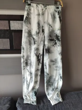 Pantalones de Bershka con un diseño tie-dye moderno. Se han usado en ocasiones contadas están bien conservados. Talla 34. Se puede ver sin ningún compromiso. Más cosas en mi perfil y más pantalones, Sueters, vestidos, tops, camisetas, - Estampado tie-dye en blanco y gris. - Cintura elástica para mayor comodidad. - Puños ajustados en los tobillos.