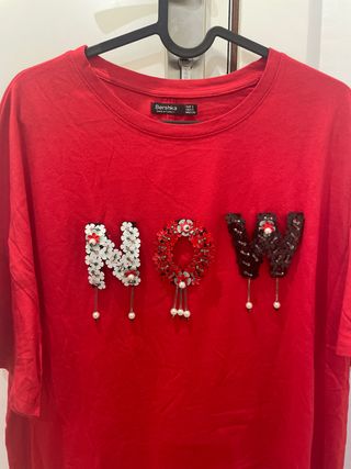 Camiseta de manga corta con letras NOW en lentejuelas muy especial,oversize. Ancho 55 y largo 65cm aprox. Perfecta psra estas fechas. - Detalle de letras NOW bordadas con lentejuelas y abalorios. - La N está decorada con flores blancas y perlas. - La O es un aro de flores rojas con detalles de perlas. - La W está hecha de lentejuelas negras y perlas.