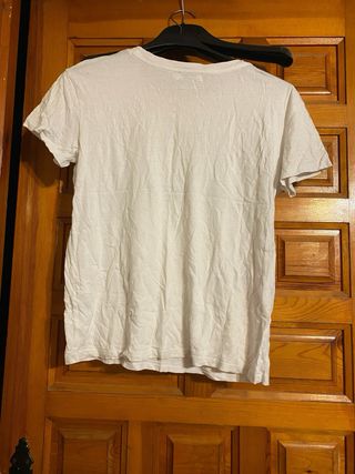 Camiseta básica de Bershka en color blanco. Un básico versátil para tu día a día. - En muy buen estado. - Diseño minimalista con detalle gráfico. - Talla L. - Cuello redondo. - Manga corta.