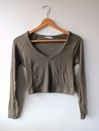 Camiseta tipo crop top de Bershka con manga larga y cuello redondo. Diseño acanalado y cierre de botones en la parte delantera. Talla XS Sin estrenar