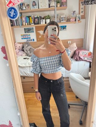 Top con estampado de cuadros vichy. - Diseño de hombros descubiertos. - Mangas abullonadas. - Corte cropped.