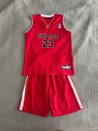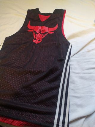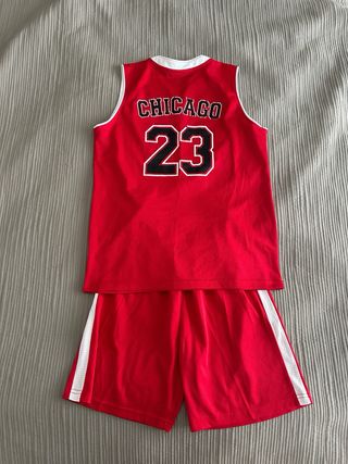 Conjunto de baloncesto réplica de los Chicago Bulls. Talla juvenil, 14Y. Incluye camiseta y pantalón corto. La equipación está en buen estado, lista para usar.