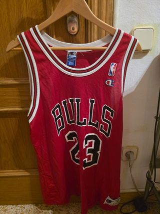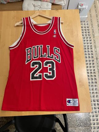 Camiseta de baloncesto de los Chicago Bulls, con el mítico número 23 de Michael Jordan. Una prenda estupenda para cualquier fanático del baloncesto. - Talla: (Añadir talla) - Marca: Champion - Color: Rojo - En buen estado.
