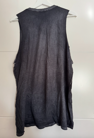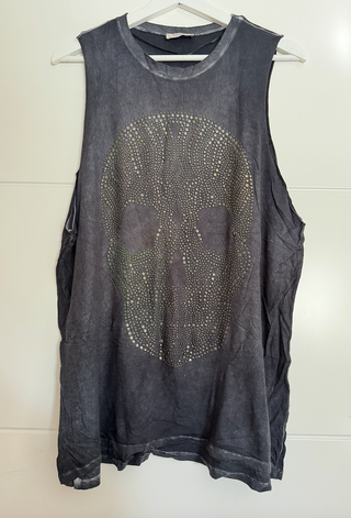 Camiseta sin mangas con un diseño de calavera. El tejido tiene un acabado desgastado que le da un toque único. La calavera está formada por tachuelitas de metal. La camiseta es oversize.