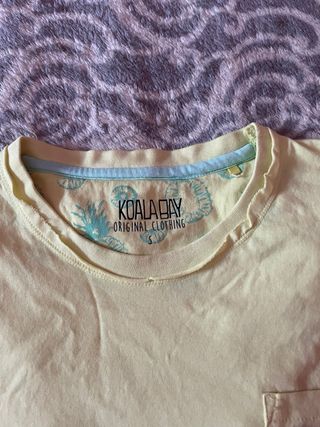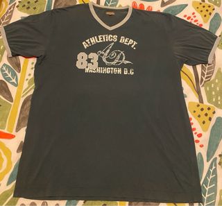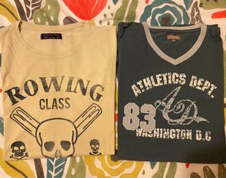Pack de dos camisetas de manga corta para chico. - Camiseta amarilla con estampado ROWING CLASS y calaveras. - Camiseta azul con estampado ATHLETICS DEPT. 83 WASHINGTON D.C. La amarilla tiene una pequeña mancha debajo del estampado y la azul un pequeño agujero en el sitio de la etiqueta.