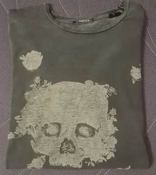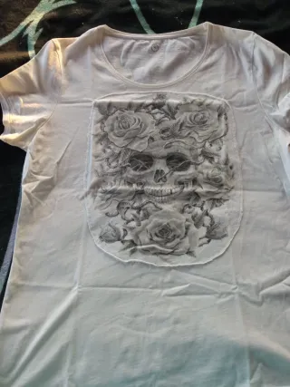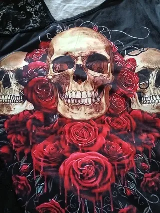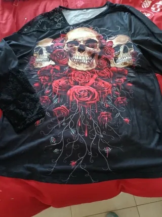 Camiseta con un diseño llamativo de calaveras y rosas rojas. - Manga larga. - Detalles de encaje en los hombros y puños. - Estampado frontal detallado. A estrenar,no envío por Correos.60 ancho por 68 largo. Original,gótica,rock