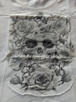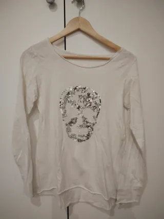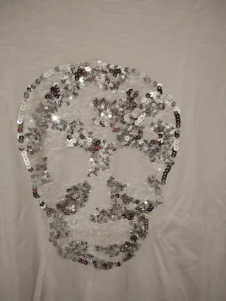 Camiseta blanca con un diseño llamativo de calavera. Es talla única. No es oversize pero es amplia. - Detalle de lentejuelas plateadas. - Diseño de calavera bordado.