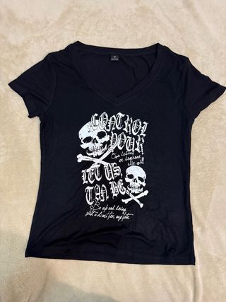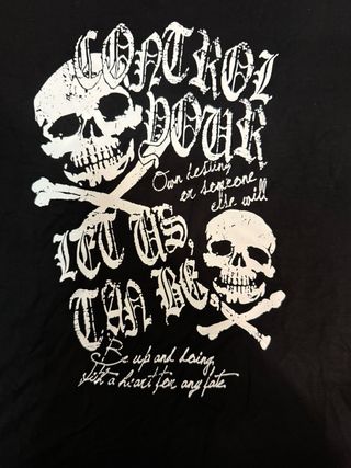 Camiseta negra con estampado de calaveras y texto. - Diseño estilo Y2K. - Estampado frontal con calaveras y huesos cruzados. - Frase CONTROL YOUR OWN destiny or someone else will LET US, THN BE.
